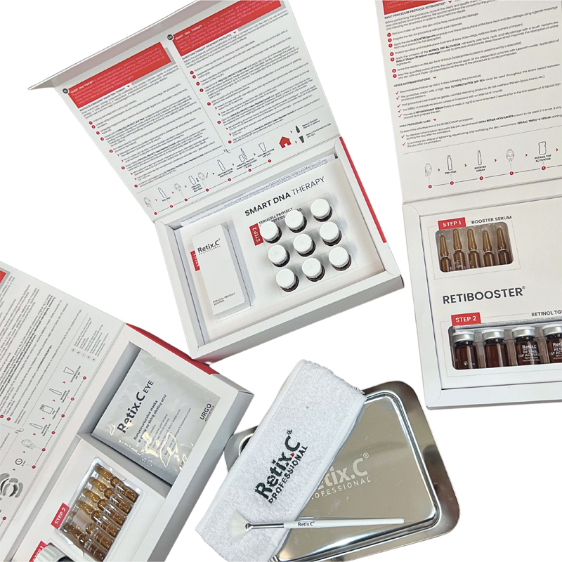 Estrategias de cuidado global RETIX.C incluye tratamientos para realizar en consulta y productos para aplicar en casa. Así, a partir de un abordaje 360o se crea un programa de cuidado global, que afianza los buenos resultados, los acelera y prolonga en el tiempo.