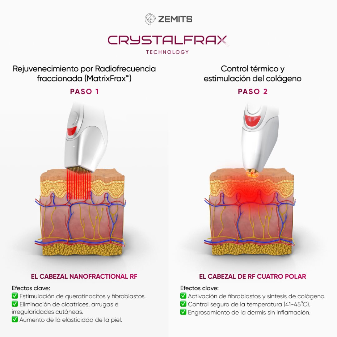 Zemits CrystalFrax Pro trabaja con energía de NanoFractional RF, actuando de forma precisa sobre las capas internas de la piel.